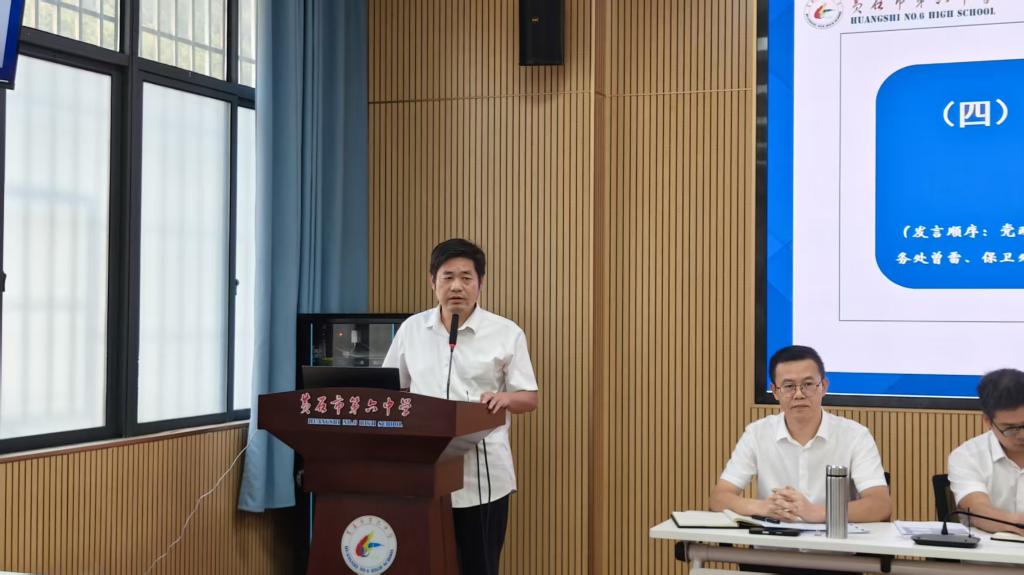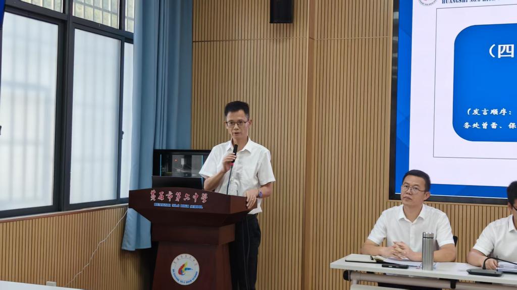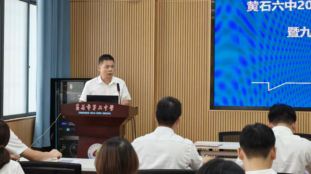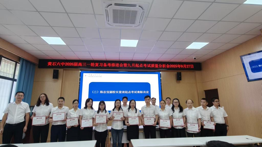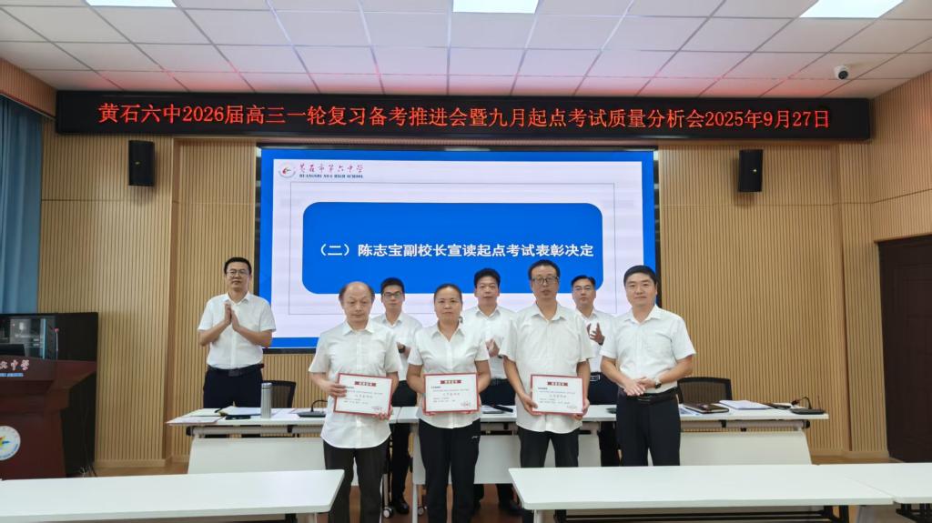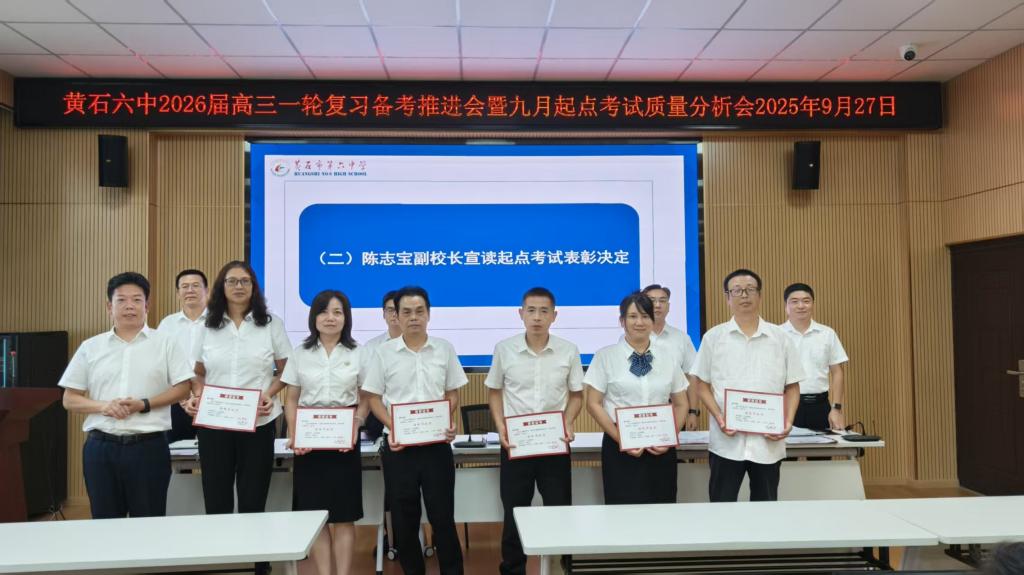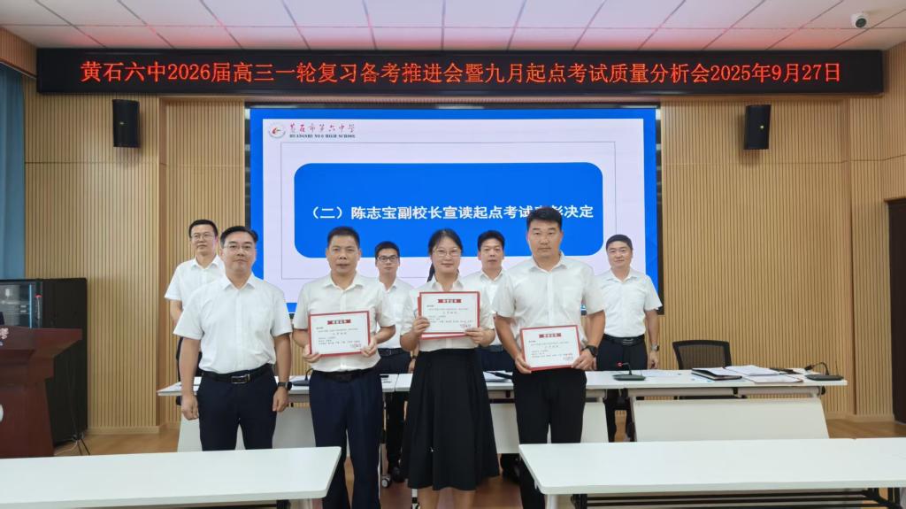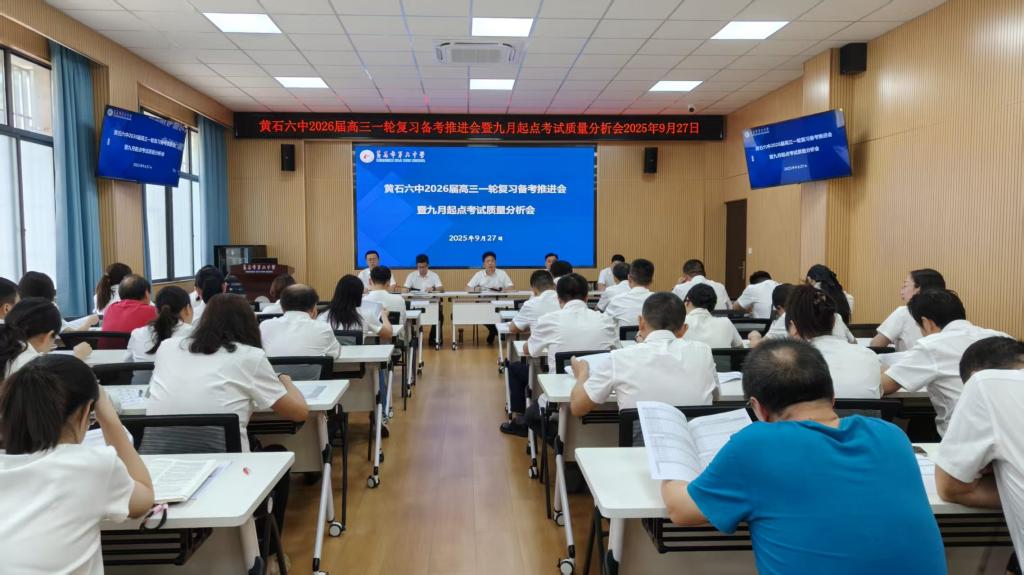 9 月 27 日下午,黄石六中 “2026 届高三一轮复习备考推进会暨九月起点考试质量分析会” 在六楼智慧教室隆重召开。校领导班子全体成员、高三年级全体教师、各行政处科室负责人、各年级主任及党支部书记齐聚一堂,围绕高三一轮复习备考核心任务,结合九月起点考试数据复盘总结、明确方向,会议由校长赵川主持。