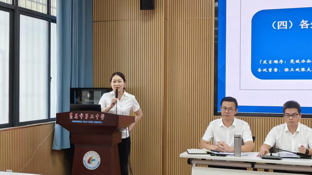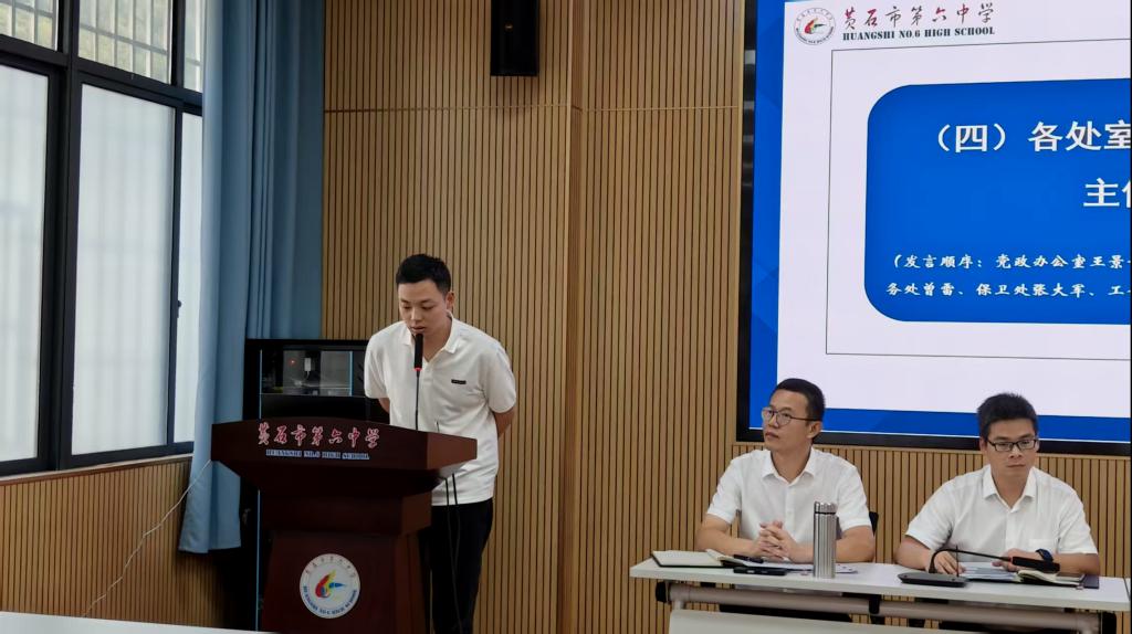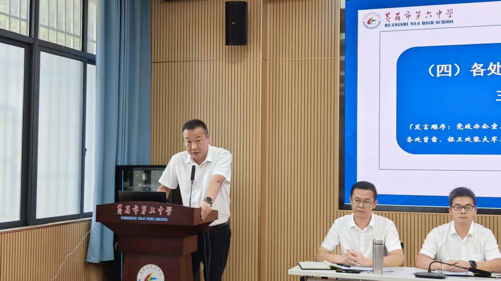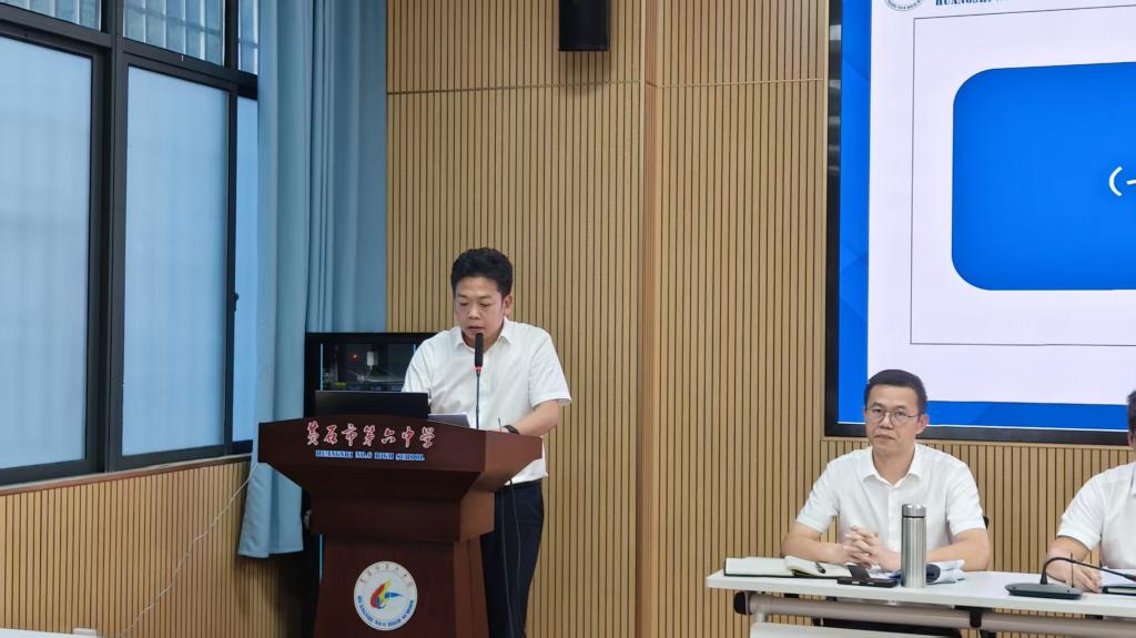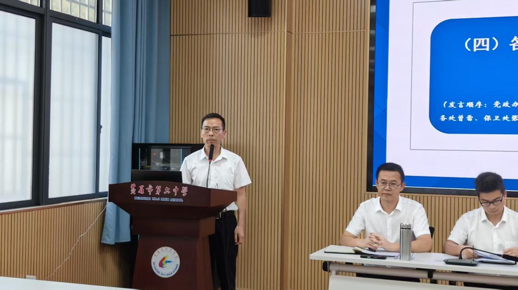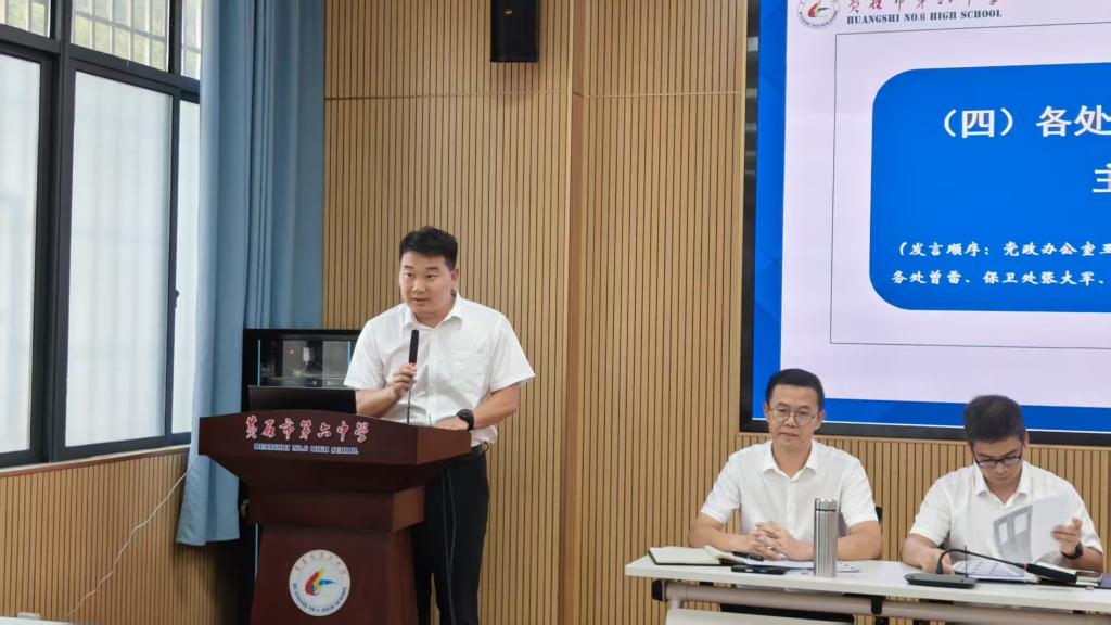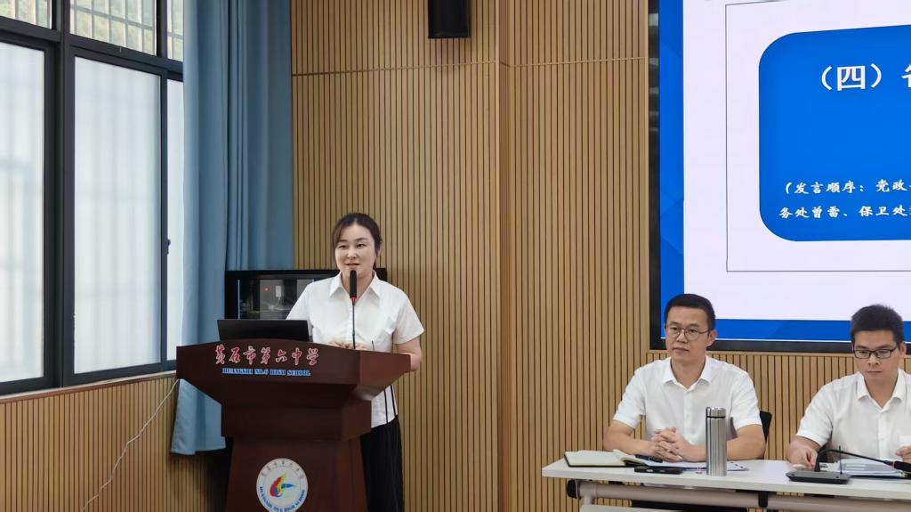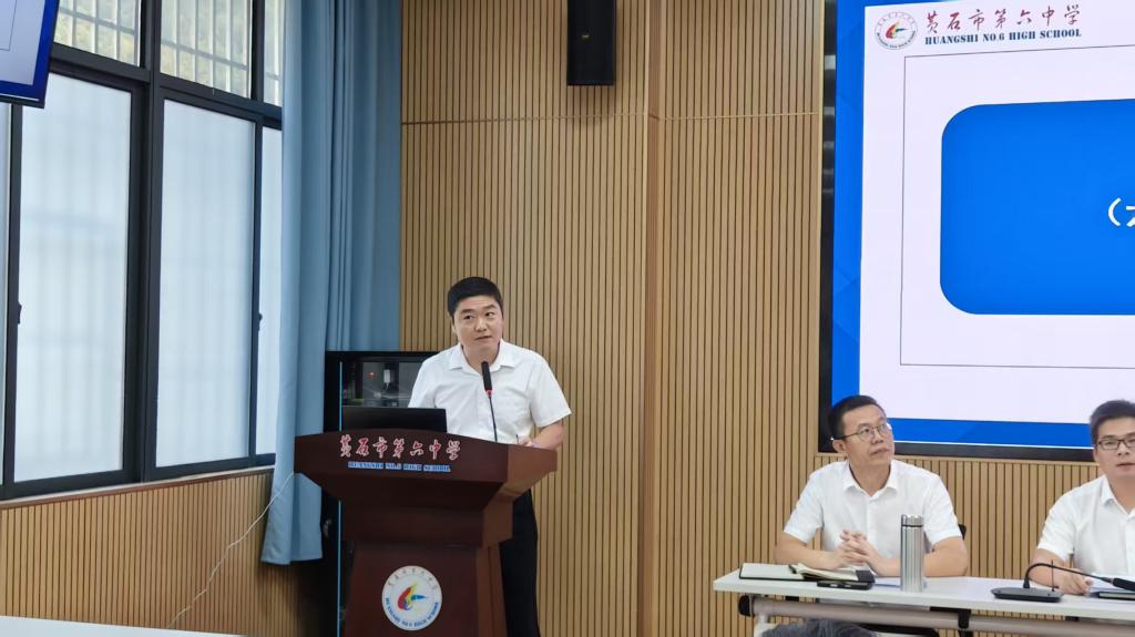 9 月 27 日下午,黄石六中 “2026 届高三一轮复习备考推进会暨九月起点考试质量分析会” 在六楼智慧教室隆重召开。校领导班子全体成员、高三年级全体教师、各行政处科室负责人、各年级主任及党支部书记齐聚一堂,围绕高三一轮复习备考核心任务,结合九月起点考试数据复盘总结、明确方向,会议由校长赵川主持。