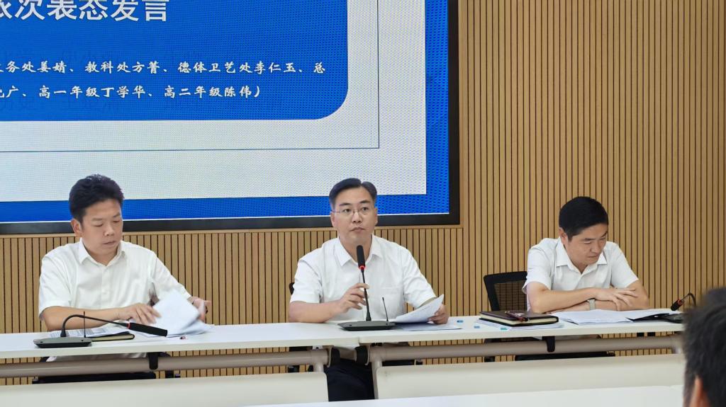为构建 “全员参与、全程保障” 的高三备考支持体系,党政办公室、教务处、教科处、德体卫艺处、总务处、保卫处、工会及高一、高二年级负责人依次上台表态,明确服务高三的具体举措。大家一致承诺:资源优先高三、服务优先高三、保障优先高三,通过邀请校外专家入校开展专题教研、高三学生心理疏导活动等各项有力措施,以“全校一盘棋”的态势为2026届高考蓄势赋能。