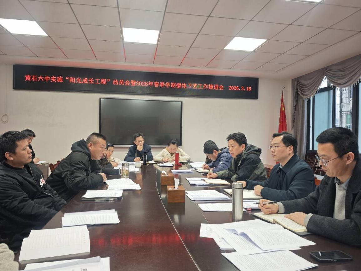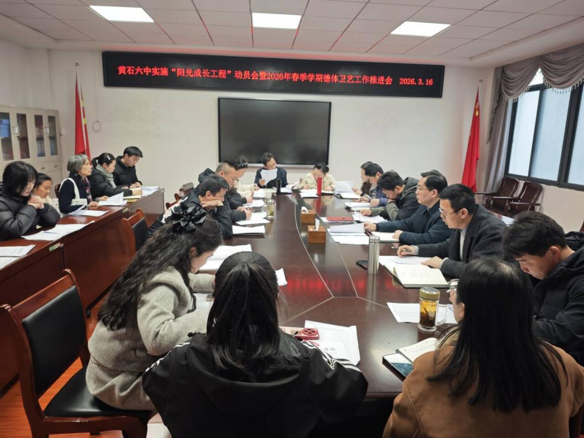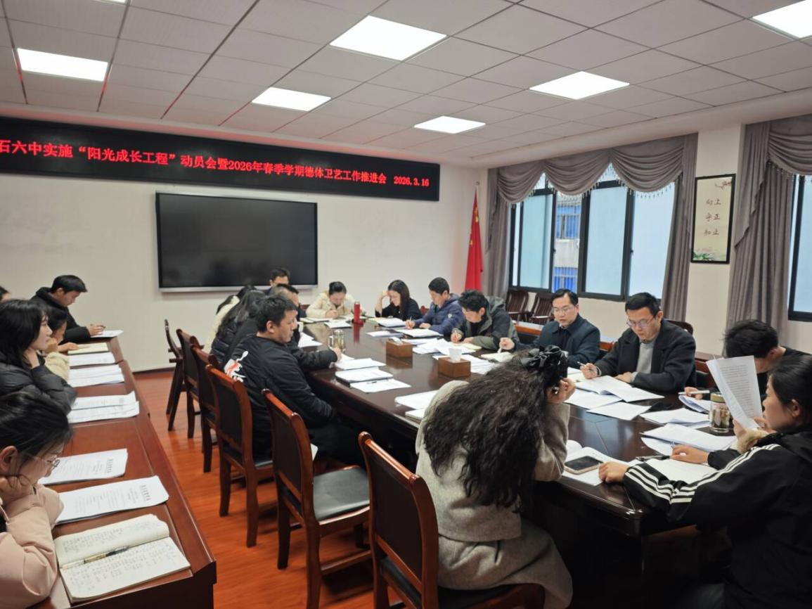 为全面落实立德树人根本任务,深入推进黄石六中“阳光成长工程”,统筹部署新学期德育、体育、卫生与艺术教育工作,2026年3月16日下午,黄石六中在五楼小会议室隆重召开了“阳光成长工程”动员会暨2026年春季学期德体卫艺工作推进会。校党总支书记余泽忠、校长赵川、副校长张玉国、副校长苏畅、相关处室及年级负责人、全校音体美教师、校医及德育线全体人员参加了会议。会议由副校长张玉国主持。