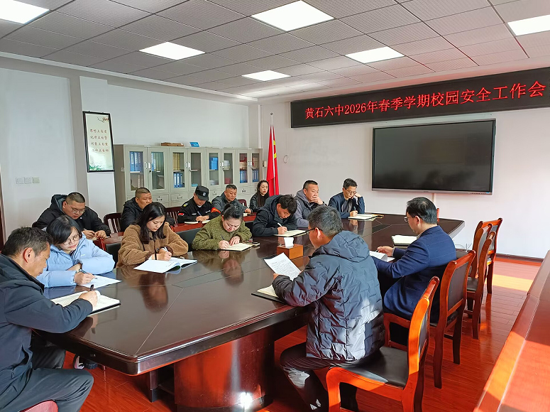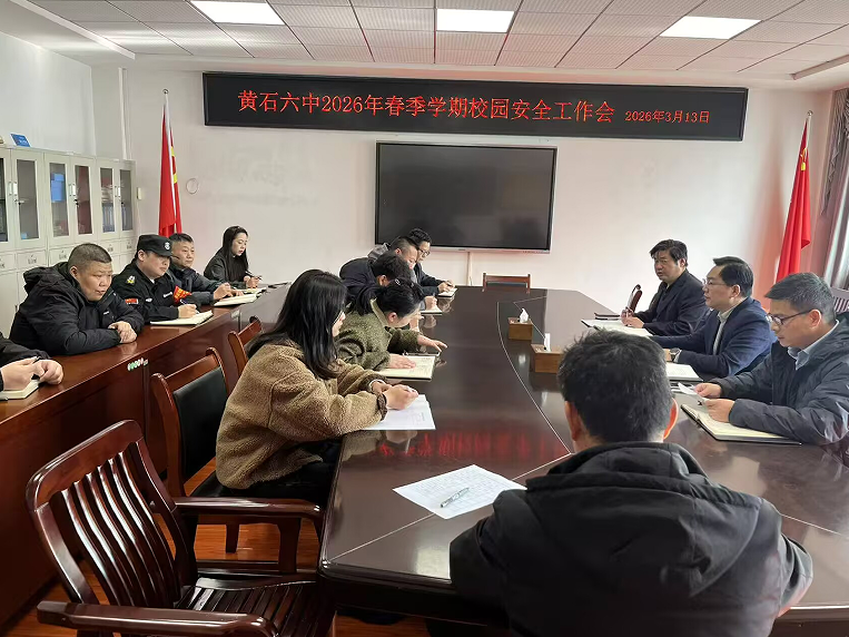 3月13日上午,黄石六中在五楼会议室召开2026年春季学期校园安全工作会议,主题为“提升认知,强化举措,周全守护校园安全”,分析春季开学安全形势,部署新学期工作。校长赵川、副校长陈志宝出席会议,各处室、年级组负责人,门卫、专职消防员、食堂负责人等参会。会议由陈志宝副校长主持。