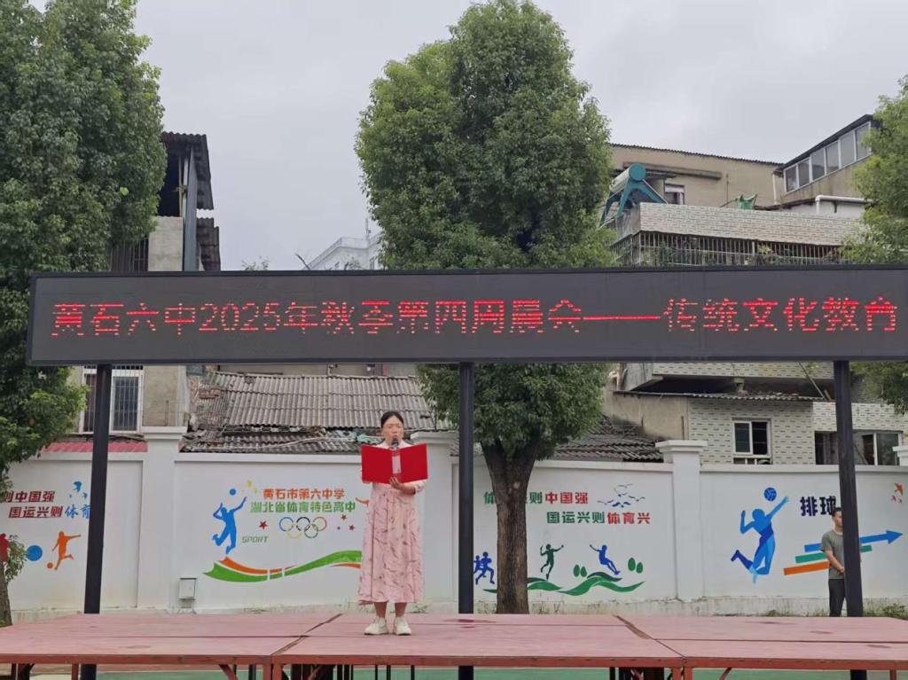 2025年9月22日上午,黄石六中全体师生齐聚操场,隆重举行第四周"传承中华优秀传统文化"主题晨会。晨会在庄严的升旗仪式中拉开帷幕,全体师生肃立行礼,高唱国歌,展现了浓厚的爱国情怀。