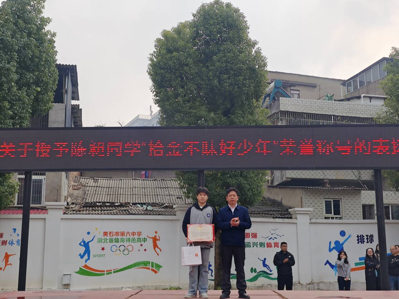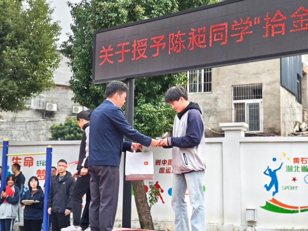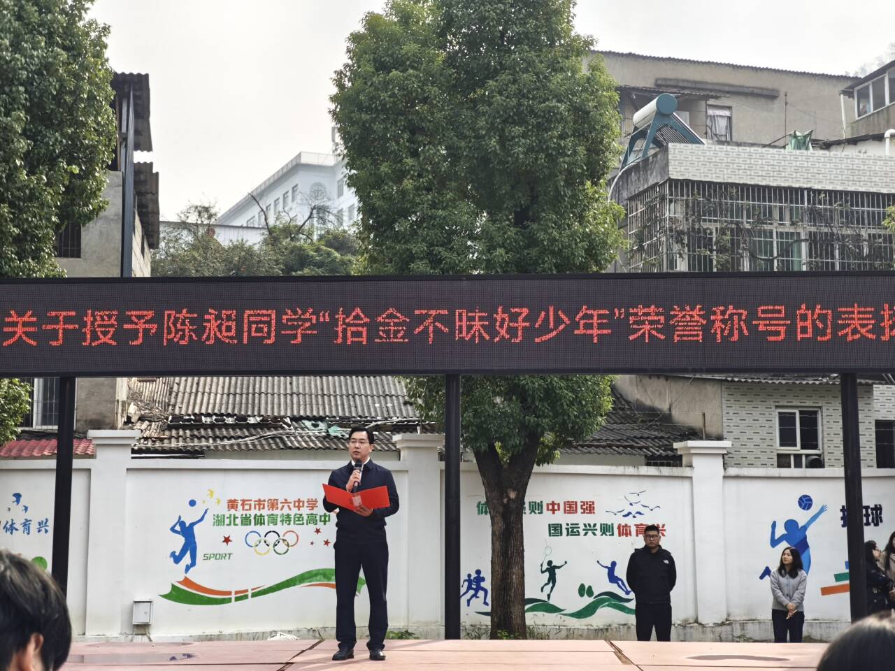 学校对高二(10)班陈昶同学进行公开表彰。据悉,10 月 21 日晚,陈昶同学在公交车上捡到钱包后,第一时间交予司机师傅协助寻回失主,其拾金不昧的行为尽显六中学子的道德素养与社会责任感。